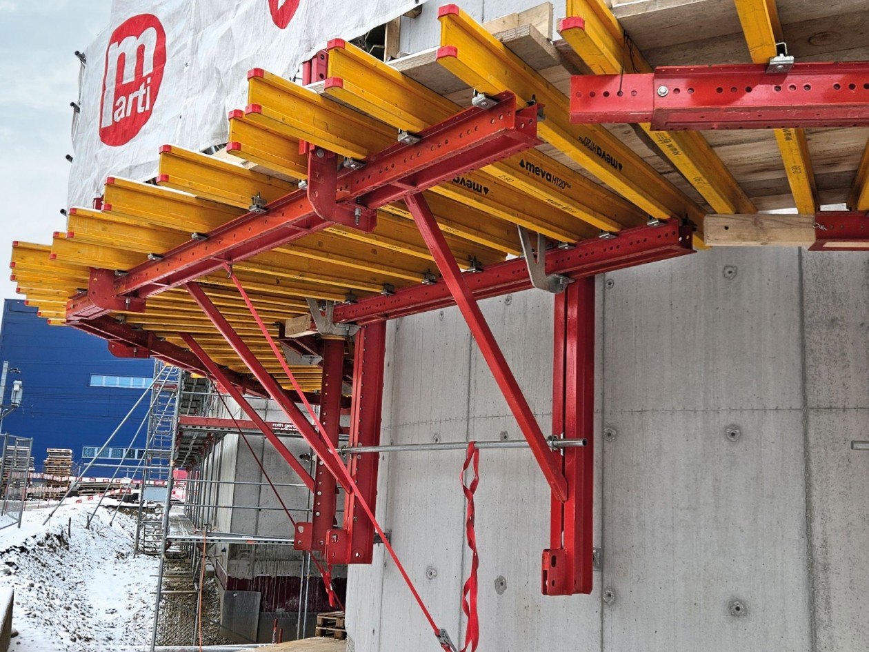 Le coffrage spécial a été déplacé sur l’ouvrage à l’aide de la JumpForm HC. De conception modulaire, cette solution MEVA permet de déployer un échafaudage en console qui, si besoin, peut être équipé d’une plate-forme suspendue pour les travaux de finition, ce qui n’a pas été nécessaire pour le présent projet. La JumpForm est ancrée dans le voile en béton armé déjà durci à l’aide de sabots d’accrochage. Elle sert de plate-forme de travail (ferraillage, coffrage et coulage du béton) et de support d’appui au coffrage.