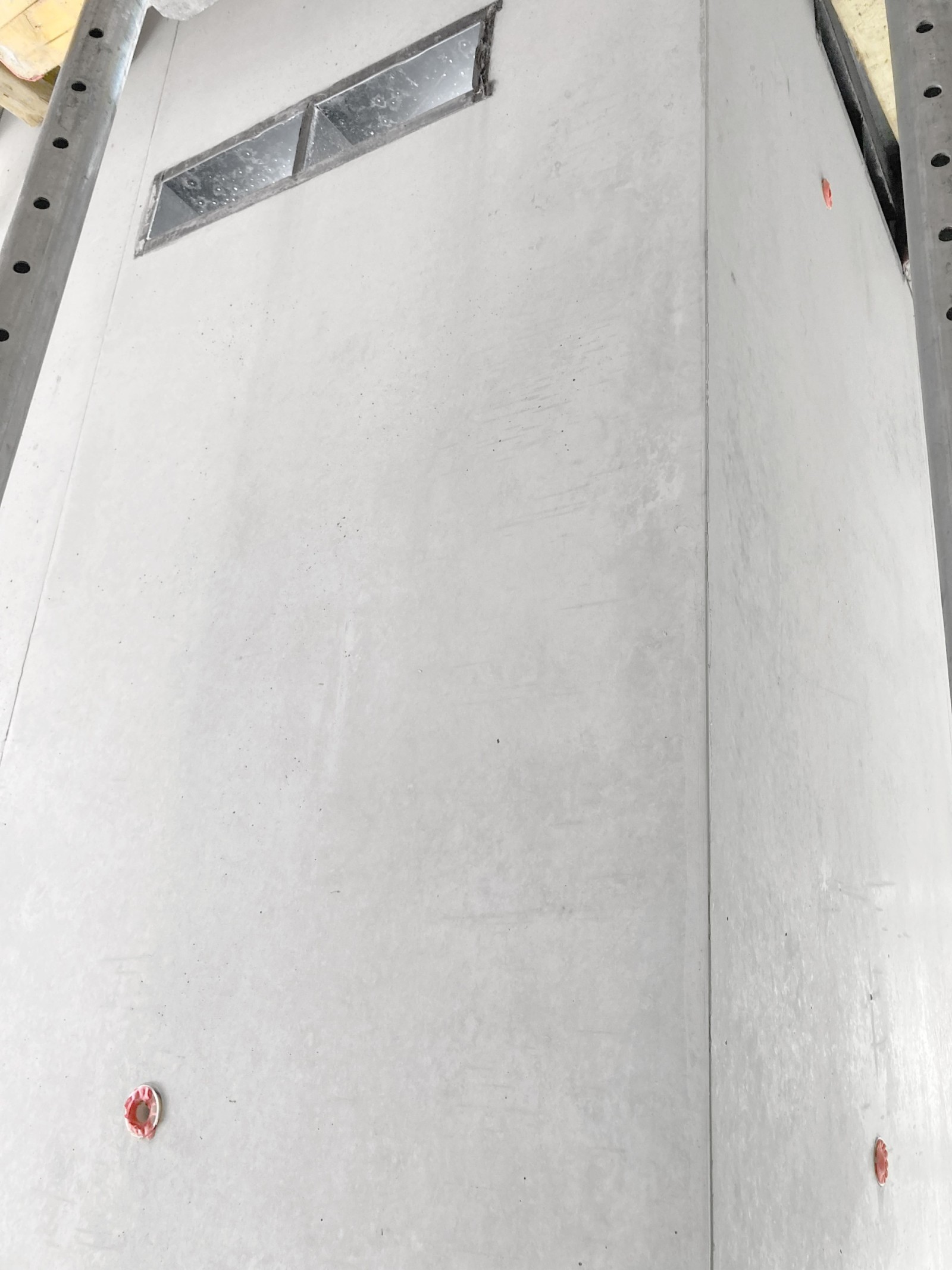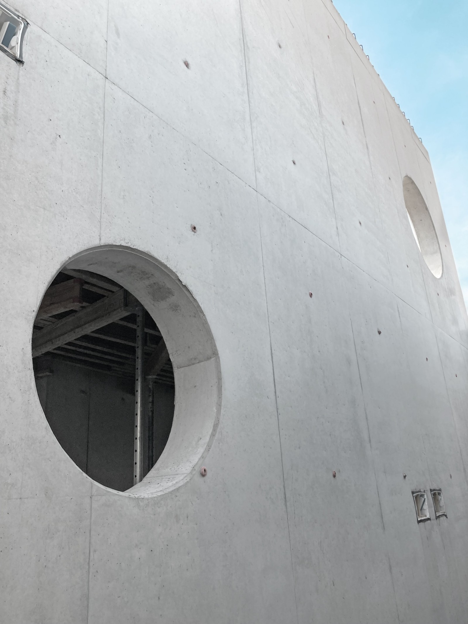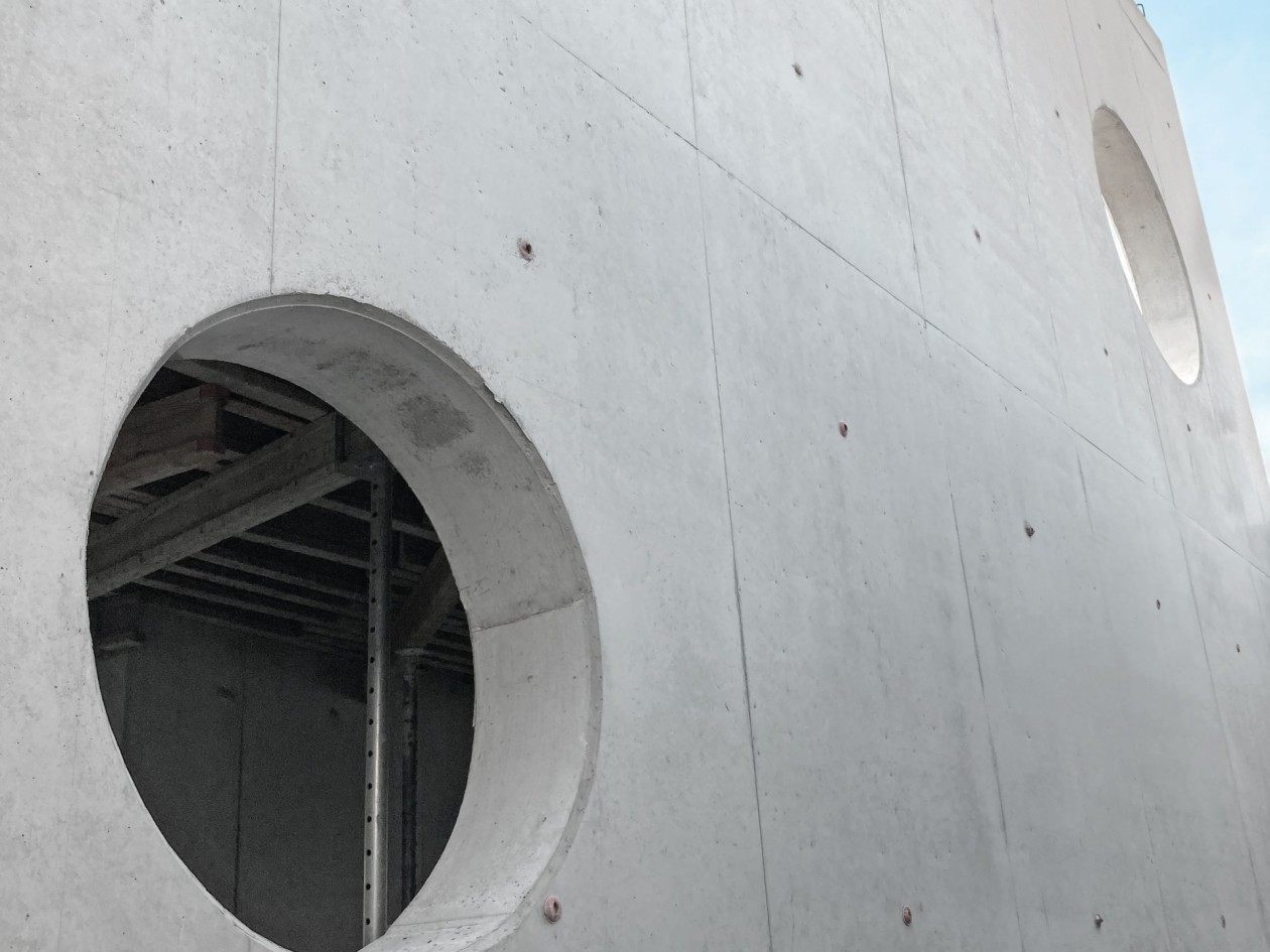 L’habillage spécial des coffrages modulaires a été réalisé par l’équipe du chantier. Des panneaux multiplis en contreplaqué de bouleau de 21 mm ont été découpés sur mesure pour obtenir nombre de largeurs et hauteurs différentes (jusqu’à 360 cm), un hydrofuge a été appliqué sur les chants. Ces peaux bouleau ont ensuite été montées sur les cadres et les peaux en polypropylène alkus des panneaux de coffrage mesurant jusqu’à 350 cm de haut. L’habillage a été posé de manière astucieuse, en décalé de la jonction des panneaux, pour obtenir un calepinage symétrique des joints et des trous de banches et répondre ainsi aux exigences esthétiques. Les panneaux en bouleau ont été vissés, par l’arrière, à travers la peau alkus, ce qui ne pose aucun problème, car les peaux alkus peuvent ensuite être facilement réparées avec le matériau d’origine.