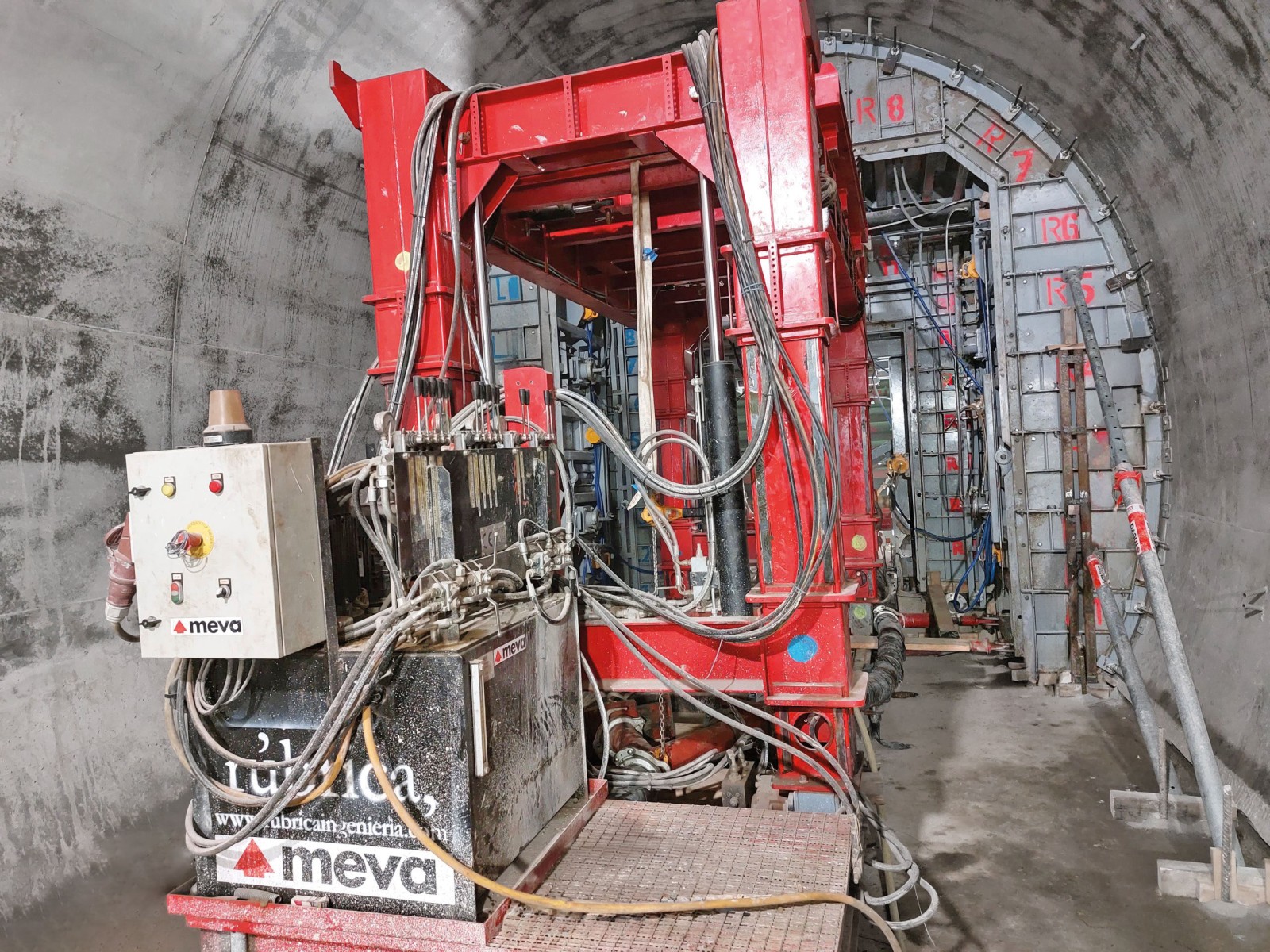 Le rameau de service est nettement différent des rameaux de secours. Il est plus étroit, de structure différente et débouche en son centre sur un puits de 3,60 m de diamètre qui descend sur une hauteur de 30 m. Il a fallu avancer pas à pas et travailler avec des solutions de coffrage sur mesure. D’abord les semelles, puis les entrées, la voûte et, pour finir, l’élément donnant sur le puits vertical. Le savoir-faire du département des coffrages spéciaux MEVA s’est révélé particulièrement utile, notamment pour le calepinage des intersections, des zones ici très complexes. Des solutions réutilisables plusieurs fois ont donc été développées, également pour fluidifier les flux sur le chantier.