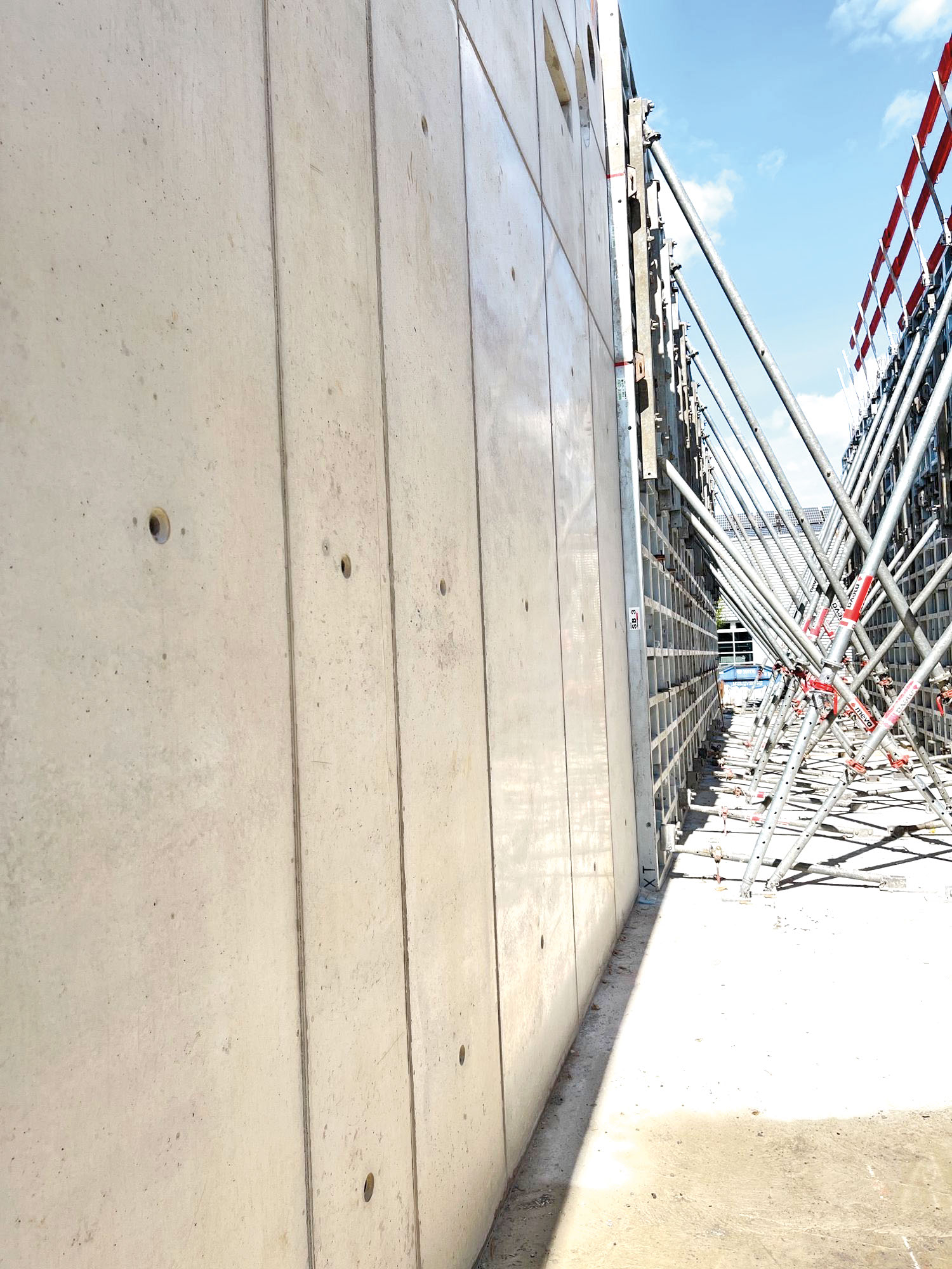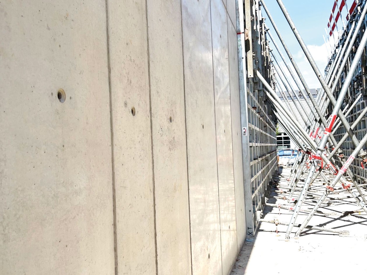 Tous les panneaux Mammut XT (990 m²) et Mammut 350 (47 m²), ainsi que les peaux en polypropylène alkus allant servir à la réalisation des compensations, embrasures et linteaux en béton de parement, ont été conditionnés en amont, chez MEVA, pour répondre aux exigences d’un béton de parement. Par endroits, il fallait même réaliser des parements de type P3+ (SBK 3+), ce qui a été obtenu par un ponçage plus fin et la pose de joints supplémentaires pour prévenir les remontées de laitance. Plus de 670 m² (bâtiment 10) et 200 m² (bâtiment 11) de voiles sont aujourd’hui parés de beaux bétons. Même les poteaux ont été réalisés avec des parements de qualité P3 (SBK 3). La hauteur maximale de coulage était de 6,30 m pour le bâtiment 11 (superposition de deux panneaux de 350 cm de haut) et de 5,55 m pour le bâtiment 10 (350 + 125 + 125 cm).