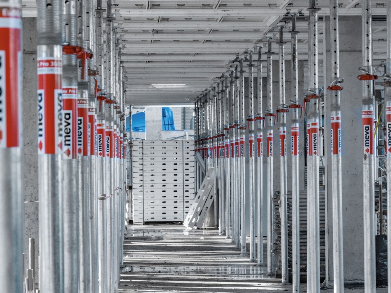Parmi les trois méthodes réalisables avec MevaDec, la méthode à poutrelles primaires et panneaux a tout particulièrement séduit les chefs d’équipe : quelques coups de marteau sur les têtes décoffrantes pour faire descendre panneaux et poutrelles primaires de 19 cm, ce qui permet, à seulement deux compagnons, de procéder au décoffrage anticipé, alors que les étais restent en place sous la dalle jusqu’à la prise définitive du béton. Les panneaux de coffrage et poutrelles primaires ont ainsi pu être utilisés sans attendre pour mettre en œuvre la rotation suivante. Cette optimisation de la quantité de matériel à mettre en œuvre a permis non seulement de précieux gains de temps, mais également de simplifier les flux logistiques sur le chantier. Et comme MevaDec indique la quantité d’étais à mettre en œuvre, les équipes de chantier avaient beaucoup de place sous le coffrage pour travailler sans entrave.