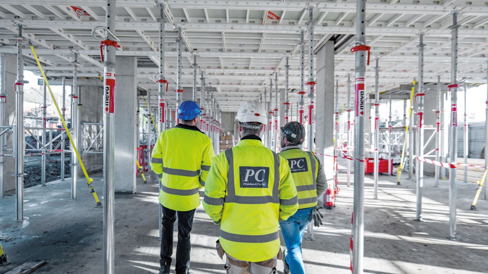 L’autre plus en matière de sécurité qui a été très apprécié par l’entreprise P. Colohan & Co., est le raccordement des panneaux MevaDec à l’aide des connecteurs MEVA. Un lot entier de panneaux de coffrage a ainsi pu être inséré dans les poutrelles primaires, puis assemblé et stabilisé en rive. Pour les compagnons, c’est un énorme progrès par rapport à ce qui se faisait avant, quand il fallait poser les panneaux de coffrage un à un sur les poutrelles primaires, en les faisant glisser sur chaque côté, avec toujours le risque que les panneaux ne se décrochent inopinément.