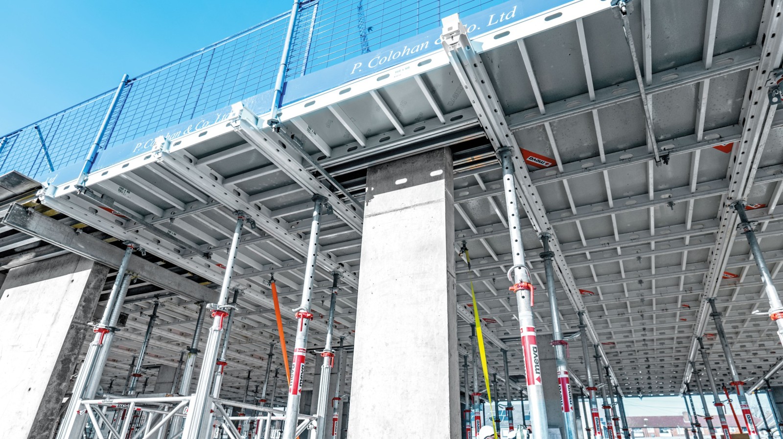 Pour assurer d’emblée une grande qualité aux parements béton, Leeds Acro a investi, en amont du projet, dans de nouveaux panneaux Mammut 350 pour réaliser le coffrage des noyaux des cages d’escalier et d’ascenseur ainsi que des poteaux. De plus, Leeds Acro a également loué de nouveaux panneaux MevaDec chez MEVA UK et les a livrés directement à l’entreprise de construction P. Colohan & Co.
