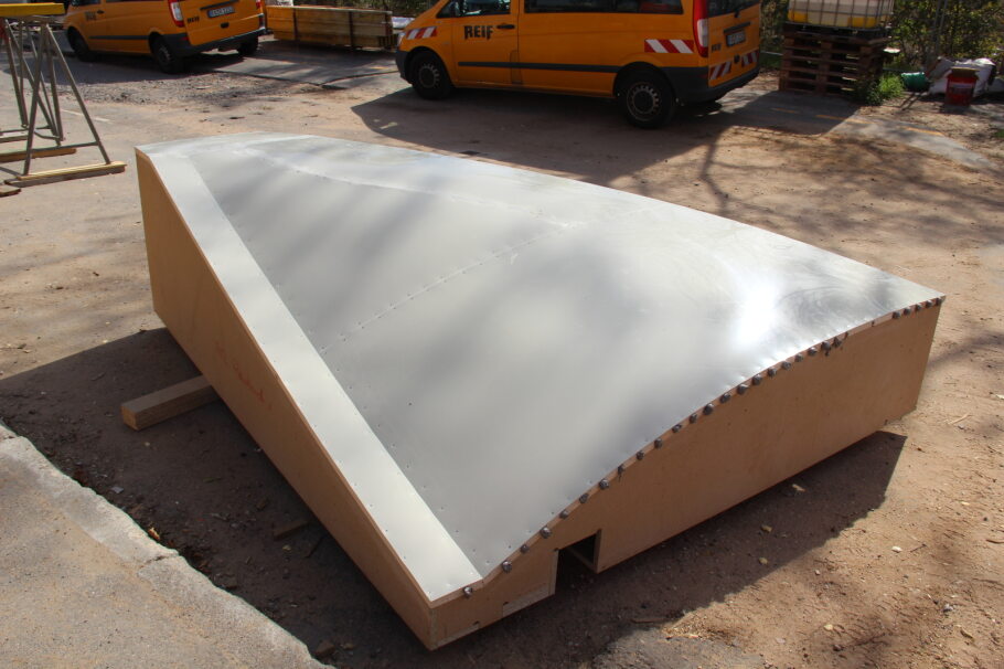 Az egyedi zsaluelemek fa tartószerkezeti vázát SF Flex műanyag zsaluhéjjal borították, amely kitűnően alkalmas a rendkívül kis hajlítási sugarak kialakításához és ezáltal az igényes egyedi zsalukhoz. A műanyag zsaluhéjak további előnye, hogy nem érzékenyek a nedvességre: nem szívják magukba a vizet, nem duzzadnak meg, és nem zsugorodnak össze. Mivel a zsaluzat építésének megkezdésétől a vasalási munkákon át a teljes boltozat betonozásáig több hét telt el, a zsaluzat hosszú ideig ki volt téve az időjárás hatásainak. De ez egyáltalán nem volt hatással a végeredményre, a kiváló minőségű betonfelületekre. Mindez fa zsaluhéjak esetén egyáltalán nem lett volna lehetséges.
