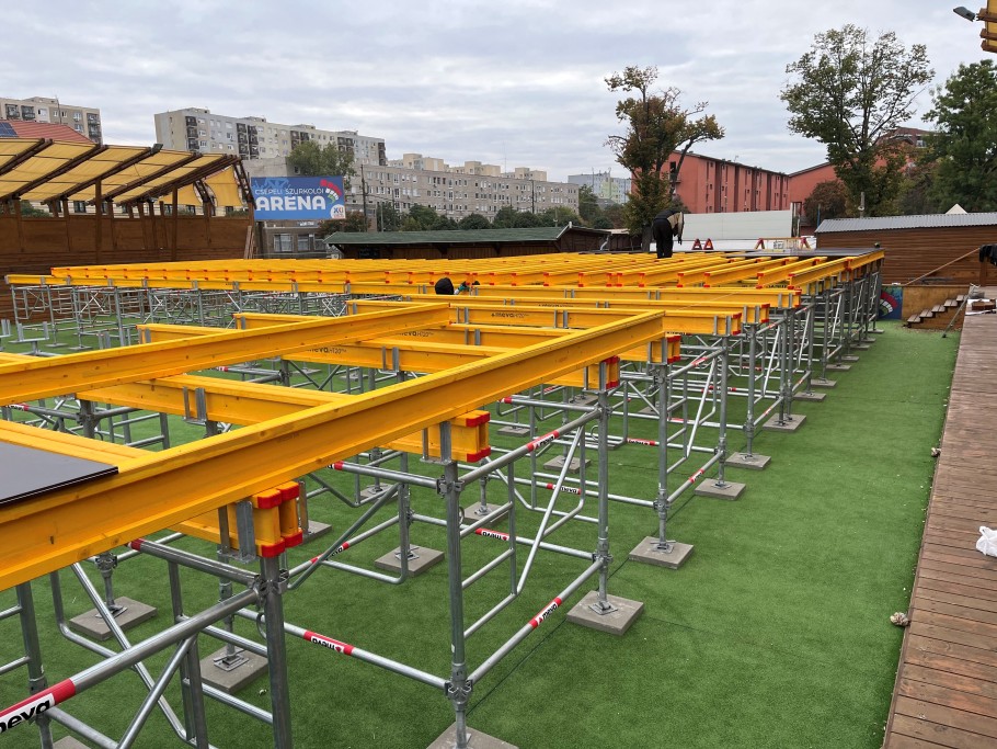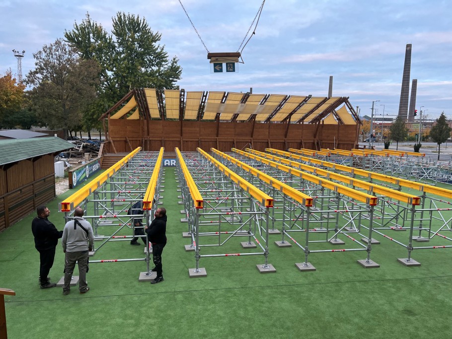 A moduláris felépítésű, könnyű, nagy teherbírású MT60 acél állvány- és alátámasztó rendszert elsősorban födémek és egyéb ideiglenes szerkezetek gyors és biztonságos alátámasztására fejlesztették ki. Ám ahogy láthatjuk, ideiglenes építmények alátámasztó szerkezeteként is kiválóan megállják a helyüket. A logikus csomópontok, a szerszám nélküli összeállítás, valamint a kompakt tárolhatóság ugyanis egyaránt segítették a pálya alapjának telepítését. Gyorsította a kivitelezést az is, hogy az állványtornyok magassága rugalmasan állítható, és teljes rendszerként alkalmas nagy terhek – például zsaluzatok, födémszerkezetek – felvételére.
