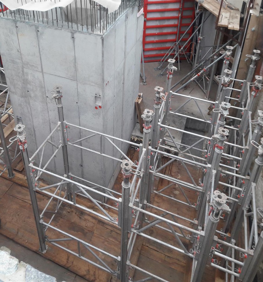 A födémhez – saját készletéből – az SP Bau cég a MevaDec zsalut és az MEP tartóállványokat használta. Mivel a könnyű súlyú és erőt kímélő MevaDec nem raszterkötött, a bezsaluzás csupán minimális érintkezési felületekkel is megoldható volt. A födémtámaszok előre meghatározott távolsága gondoskodott a biztonságról, optimalizált anyagkészlet és a lehető legnagyobb mozgásszabadság mellett.