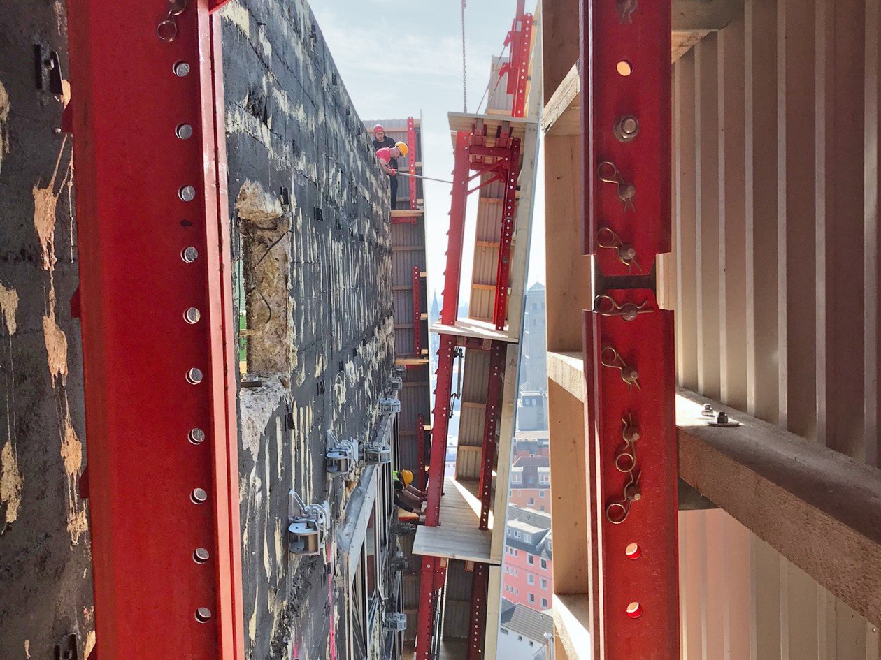 Kezdetben minden szokatlan volt. De a Linkamp cég tapasztalt csapata már a felső emelet visszabontása után fokozta a tempót: Azóta emeletről emeletre, bonyodalmak nélkül, folyamatosan halad a munka. Thorsten Blasse, a Linkamp cég projektvezetője számára egyértelmű, hogy a MEVA-rendszer választása helyes döntés volt.