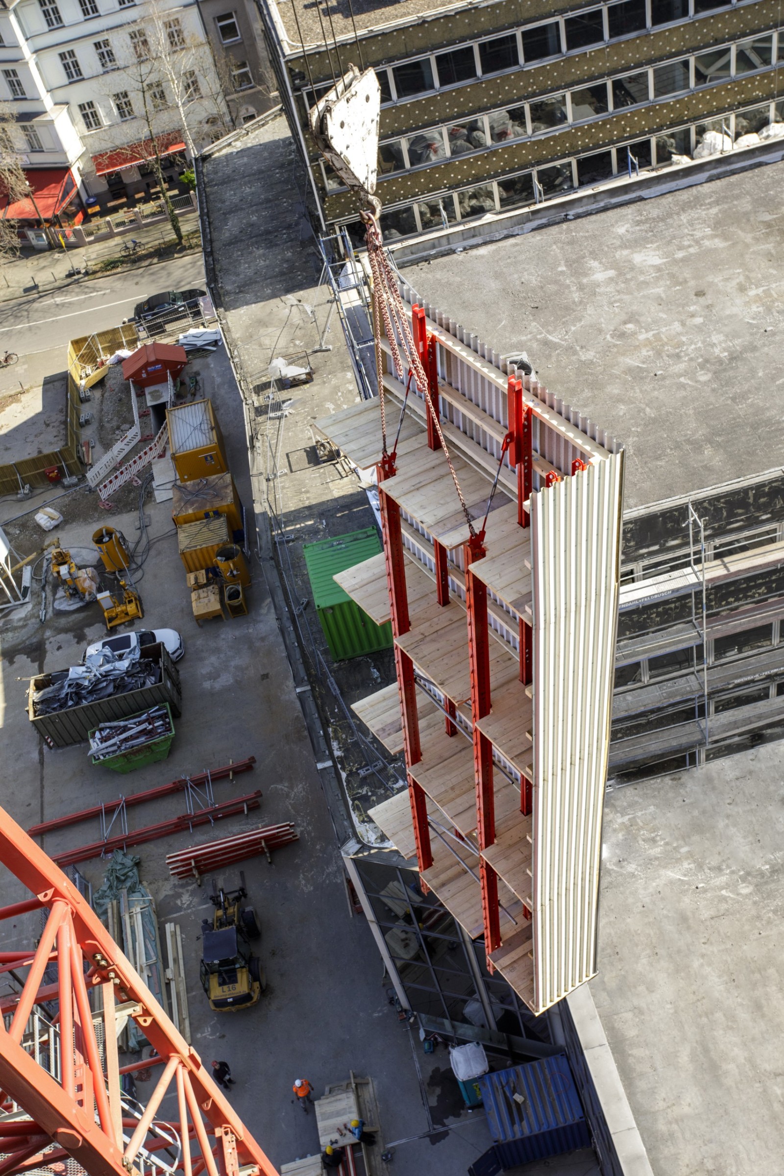 2022. tavaszán két szerelőhelyen, biztonságos körülmények között talajon szerelték össze a 18 kúszóegységet. Az egységek 4,60 és 5,10 méter szélességűek, négy járófelületből, védőkosárból és zárt trapézlemezből állnak. Nyolc egységre állványvég-lezárót is szereltek, ezzel biztosítva a veszélytelen körbejárást és az épület sarkain a lehető legbiztonságosabb munkavégzést. A szerelőhelyekről daruval emelték fel az egységeket és helyezték be felülről az előkészített, billenőszerkezettel felszerelt vezetőpapucsba. Amint beakasztották és reteszelővel rögzítették a vezetősíneket, már hozhatták is a következő kúszóegységet. Gyorsan ment a több, mint 30 m hosszú és közel 15 m széles épület négy felső emeletének burkolása.