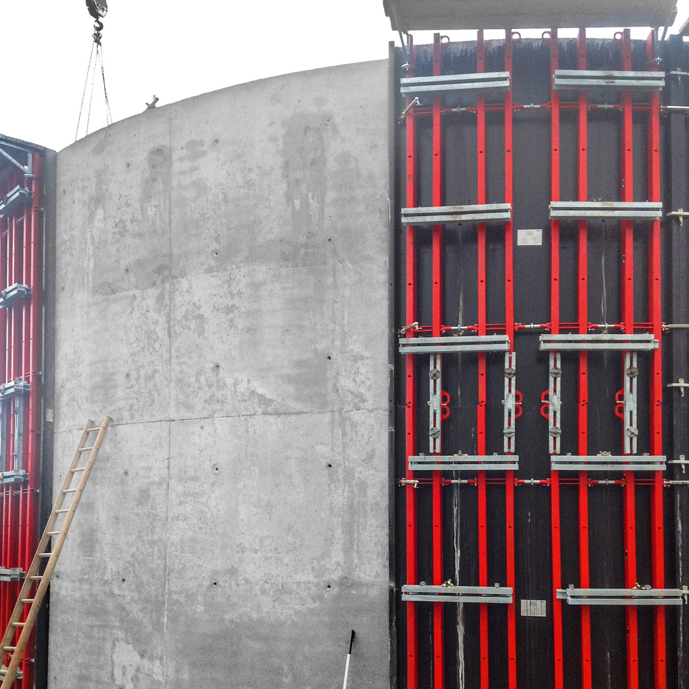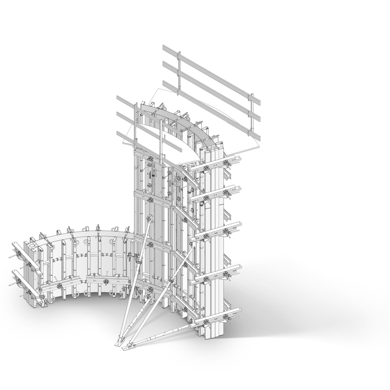 A sokoldalú rendszer 250 cm-es és ennél nagyobb sugarú íves falakhoz használható, fokozatmentesen beállítható zsaluelemekből áll, amelyek azonnal felépítésre készek.