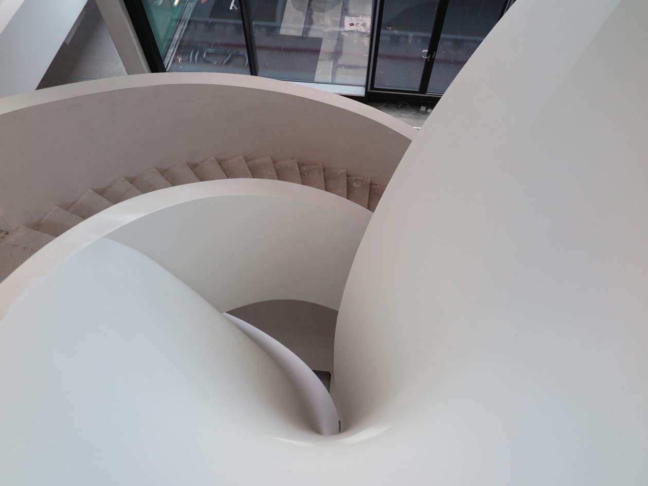 Teil der anspruchsvollen Architektur und eines der schwierigsten Bauteile war der einzigartige geschwungene Treppenaufgang im Foyer, der sich um eine innenliegende Tulpenskulptur in die Höhe dreht.