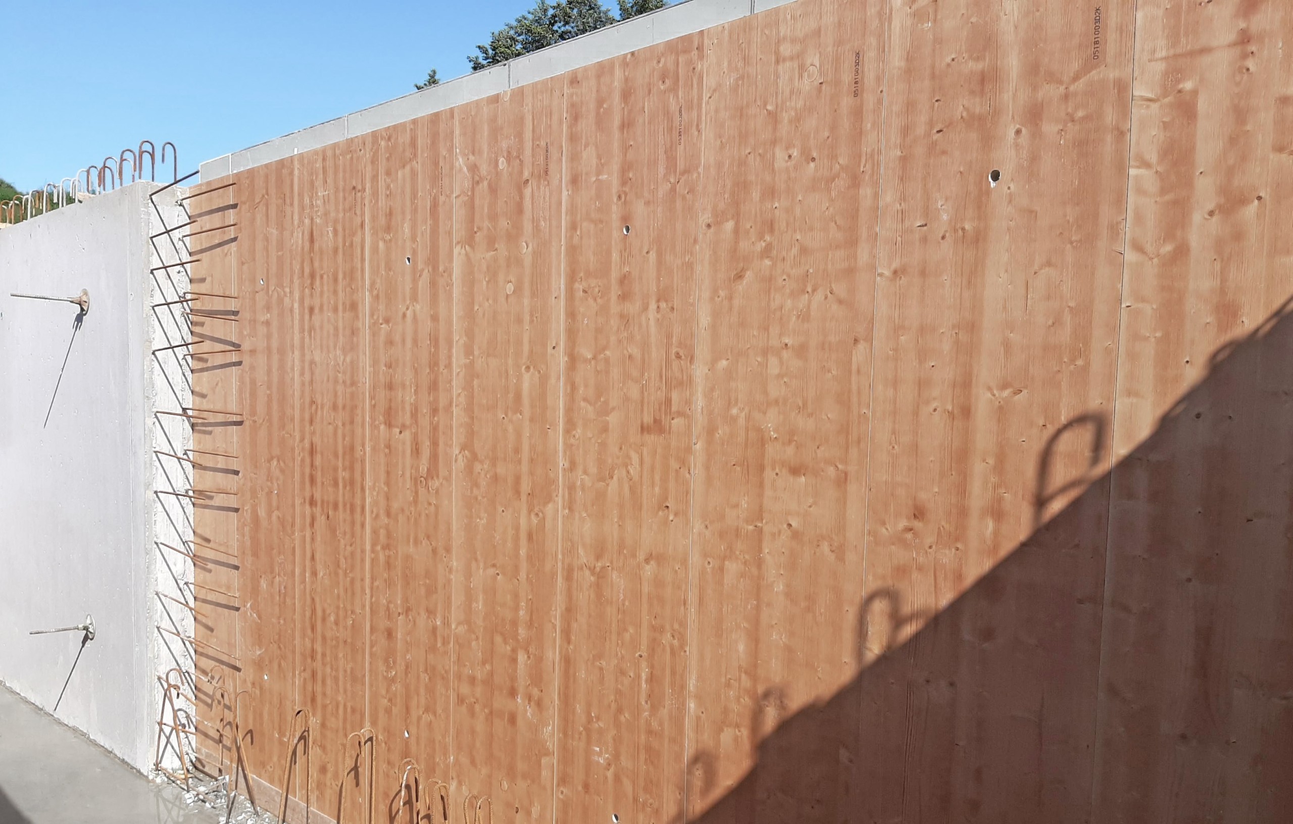 Die Brogini AG war unter anderem für den Bau einer Stützmauer und eines Treppenhauskerns in Sichtbetonqualität verantwortlich. Für einen abgerundeten Teilbereich der Mauer, 3,20 bis 3,80 m hoch, nutzte das Team um Bauführer Igor Petrovic zwei Sonderkonstruktionselemente mit unterschiedlich kleinen Radien. Der Teilbereich sollte sich optisch exakt ins Gesamtbild der Stützmauer integrieren. Die Holzmaserung der stehenden Latten wurde bewusst in den Blickpunkt gerückt. Um die Nutzung identischen Holzmaterials zu gewährleisten, abweichende Maserungen und differierende Verfärbungen zu verhindern, erfolgte die Beplankung der Schalungskonstruktion durch Brogini.
