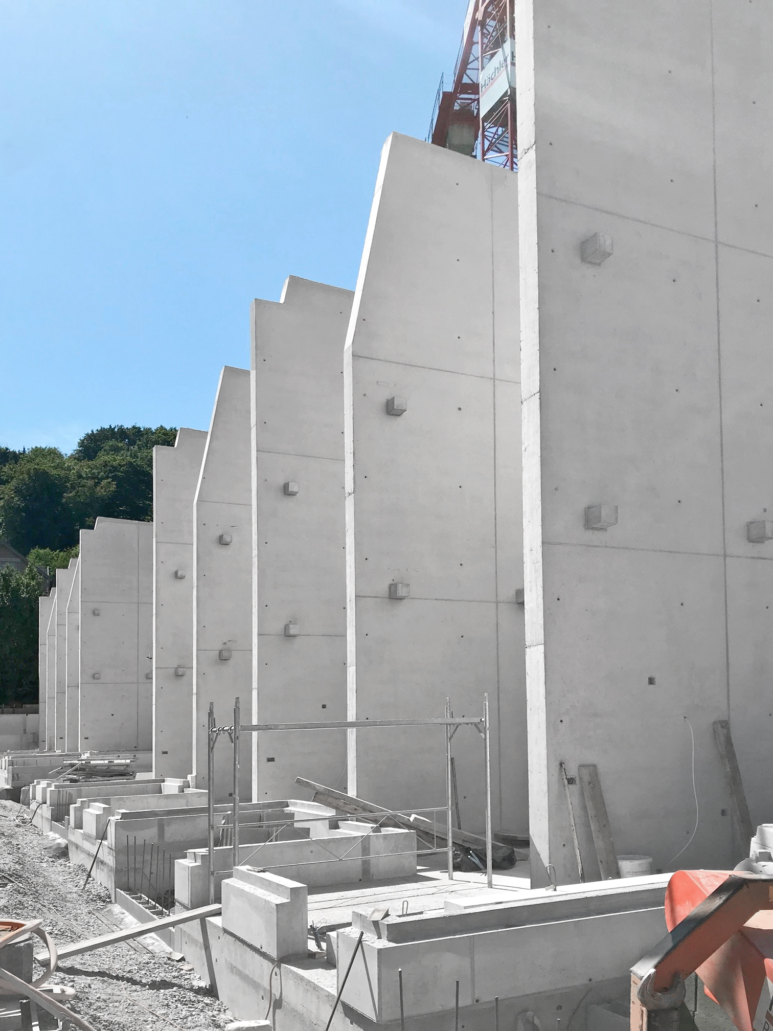 Terwijl de kelder op conventionele wijze werd gestort, was het storten van de tussenmuren van de huizen een uitdaging. Het Hächler-team rond afdelingshoofd Walter Herzog zette al zijn knowhow in. Ook van het bekistingssysteem werden hoge prestaties geëist. De muren zijn elk 28 cm dik, 10,50 m hoog en 11,37 m lang, en moesten volgens de vereisten van de opdrachtgever worden uitgevoerd in een hoge zichtbetonkwaliteit: met bekisting type 2 voor zichtbare oppervlakken met een nette, uniforme structuur en met behulp van een nieuwe, onbeschadigde bekistingsplaat. De bouwonderneming huurde 250 m² elementoppervlak van het Mammut-XT systeem en Triplex schuine schoren. De grootvlaks bekisting met een volvlaks mogelijke betondrukopname van 100 kN/m² en 8,75 m² bekistingsoppervlak per element (3,50 x 2,50 m), maakte enkelvoudig verankeren met XT-konuscenterpen 23 mogelijk zodat er met slechts enkele onderdelen snel kon worden bekist. De bekistingsplaat van de standaard vol kunststof plaat alkus biedt optimale voorwaarden voor een constant hoge kwaliteit van het betonoppervlak.