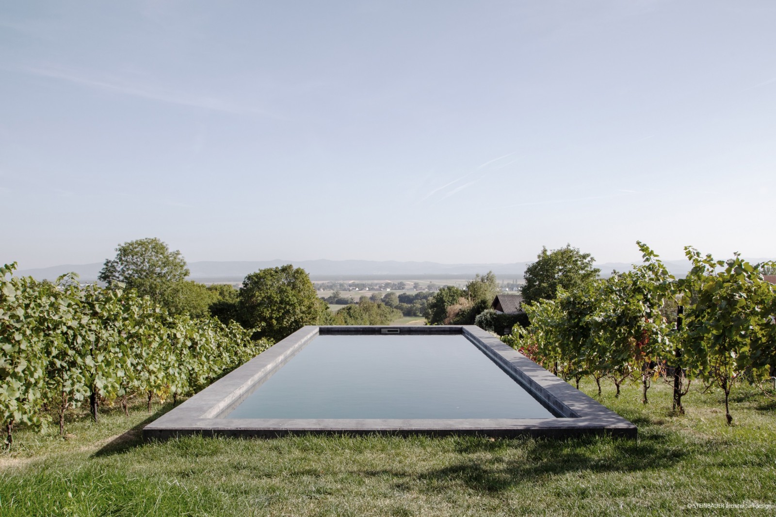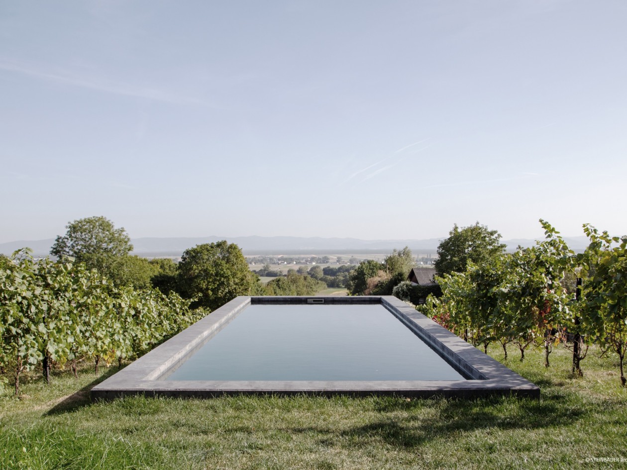 In de thermenregio van Neder-Oostenrijk, midden op een mooie wijnhelling, werd een klein maar fijn zwembad gebouwd van donker ingekleurd beton – een blikvanger met uitzicht als het ware. De focus lag op een duidelijk ontwerp en hoge kwaliteit.