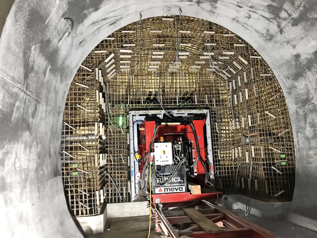 Aangezien de openingen kleiner zijn dan de doorsnede van de verbindingstunnels, was er een speciale oplossing nodig om de bekistingstechniek in het midden van de doorgang en er weer uit te kunnen verplaatsen. Samen met zijn partner voor stalen bekistingen, Rúbrica Ingeniería, ontwikkelde MEVA een flexibele bekistingswagen die het mogelijk maakte om alle bouwsecties te storten en hierbij maar weinig aanpassingen nodig had. De constructie bestaat uit een verrijdbare transportwagen op rails, inclusief hydraulica met besturingseenheid, bekisting en werksteigers.