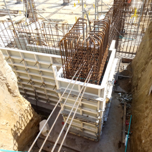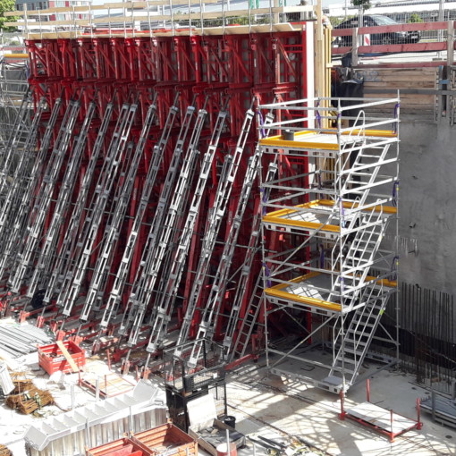 MEVA were able to tailor a perfect solution with standard rentable parts. The wind loads were transferred by two Space shoring towers, which were also positioned in the central reservation. The formwork and bracing – which consisted mainly of standard parts with the purpose-built additions, as well as all necessary safety accessories – ensured a fast and easy to assemble system for use in this situation.